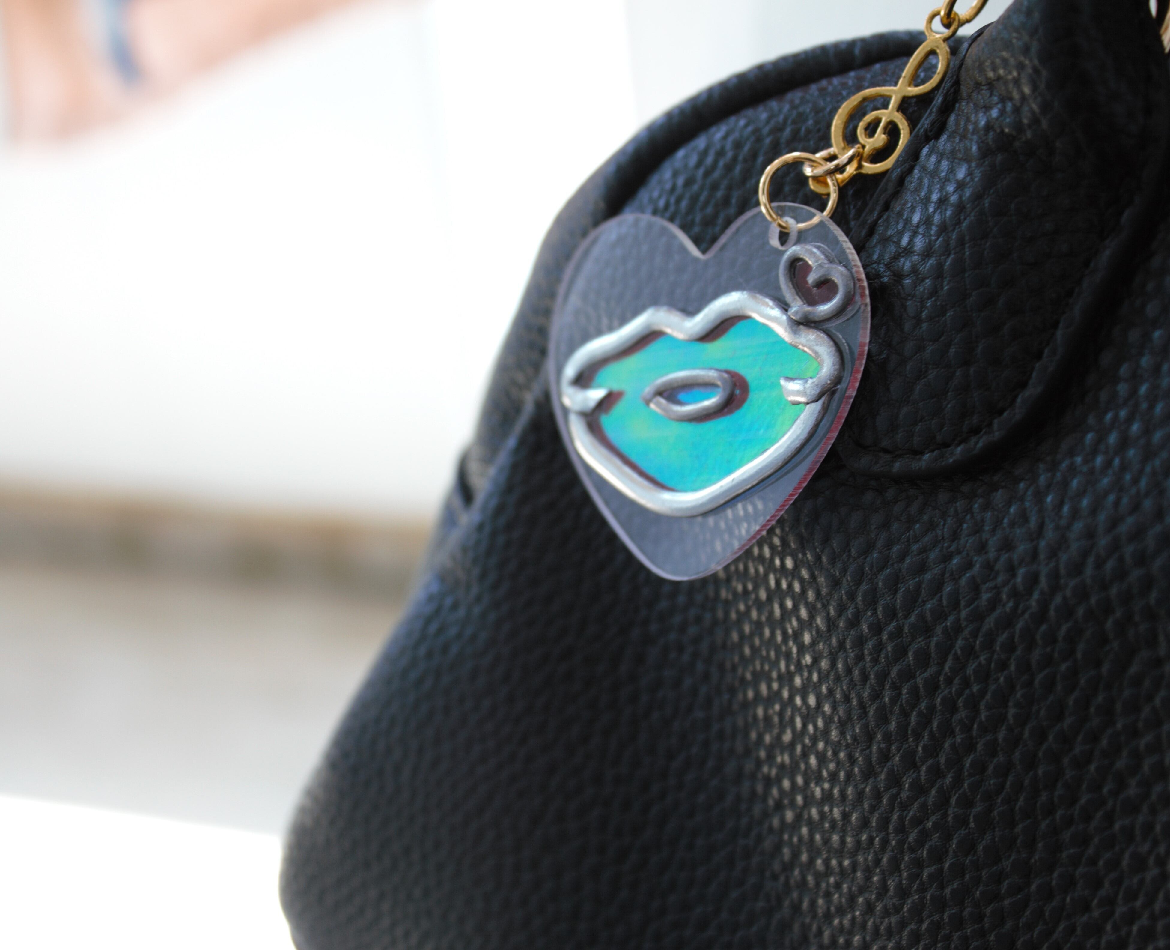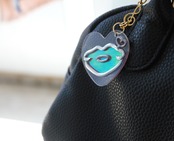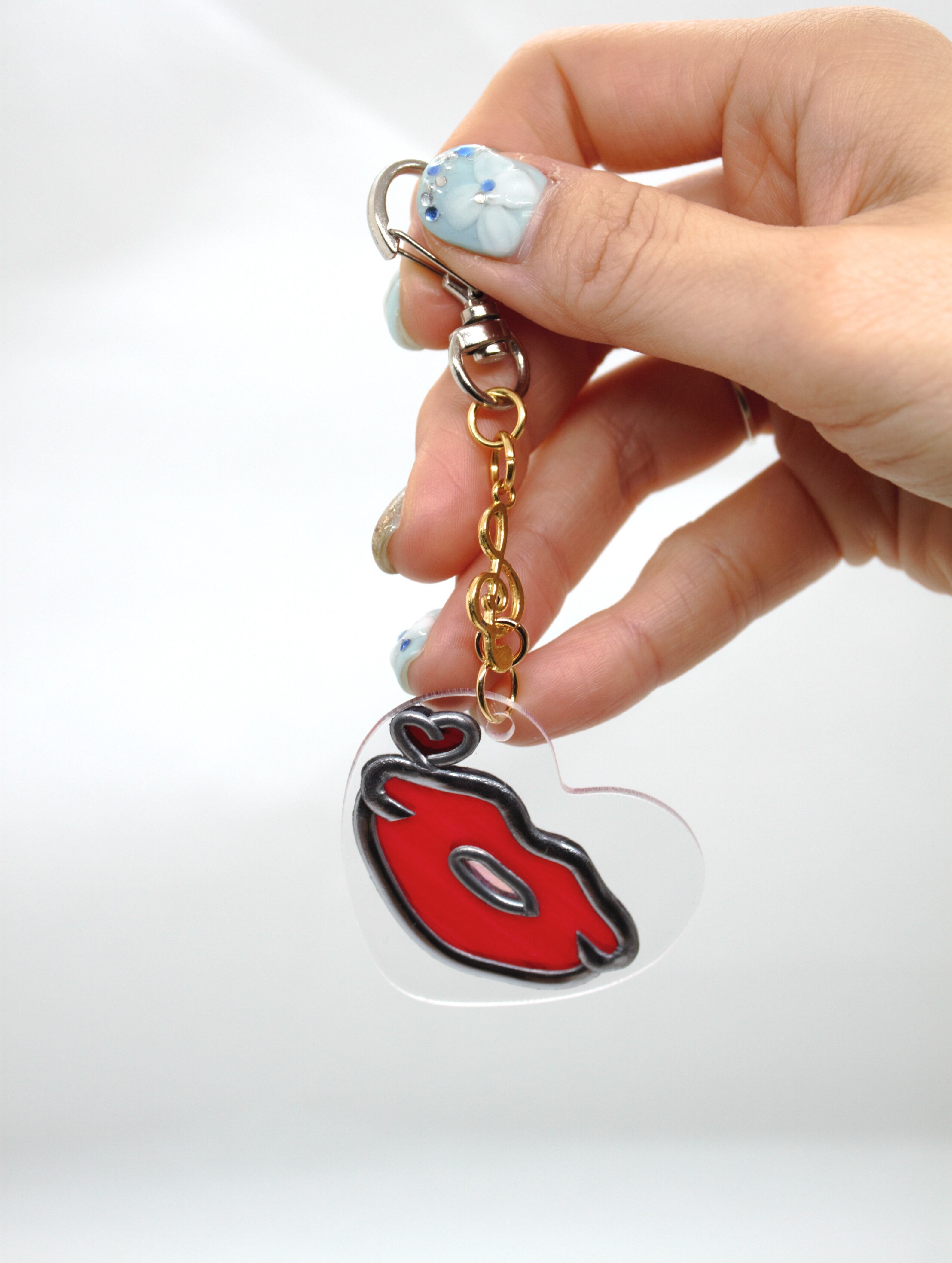 角度で変わる美しいオーロラの輝きが特徴のリップデザイン グラスアートキーホルダー。
